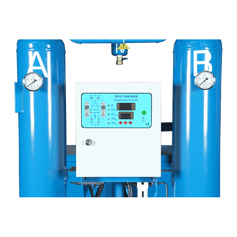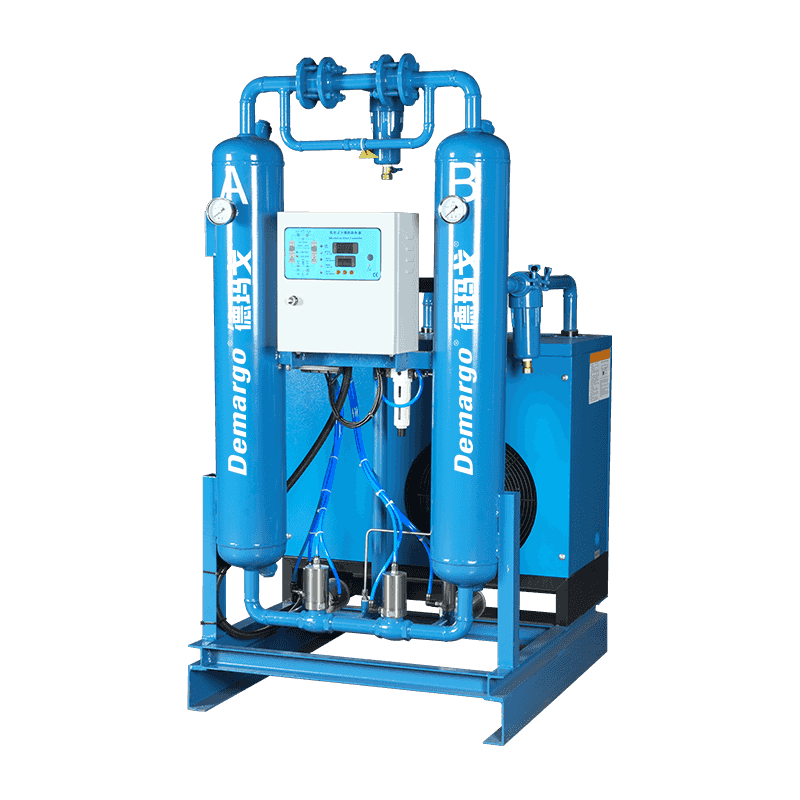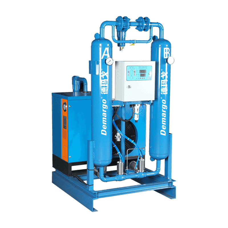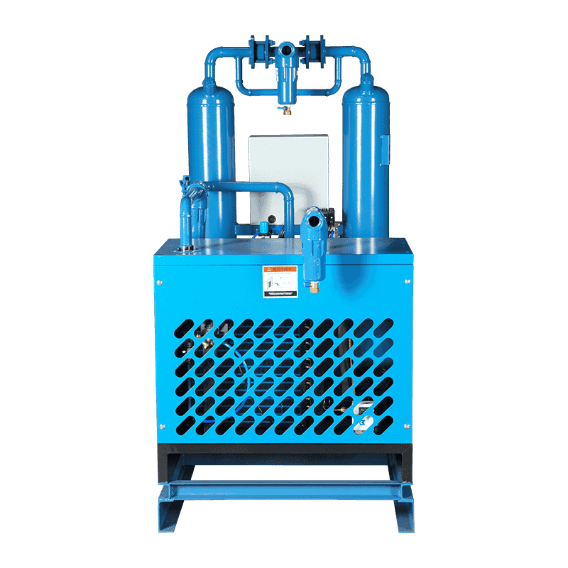 U kombiniranom kombiniranom stroju, komprimirani zrak prvo ulazi u predkorušicu u hladnoj sušilici radi razmjene topline suhim komprimiranim zrakom iz sušilice, tako da se temperatura suhog komprimiranog zraka povećava, a istodobno se smanjuje temperatura komprimiranog zraka u evaporator, a dio vode se uklanja u evaluaciju, a smanjuje se u sobi. Zatim ulazi u isparivač radi izmjene topline tako da se komprimirani zrak ohladi na temperaturu rosišta od oko 5 ° C. Većina vode, ulja i nekih nečistoća u komprimiranom zraku se ovdje kondenzira, a zrak i voda razdvajaju se separatorom zračne vode, a zatim se voda i ulje ispuštaju kroz automatski odvod. Osušeni komprimirani zrak ulazi u sušilicu kroz filter za uklanjanje ulja i dalje uklanja vodu na temperaturu rosišta koja zadovoljava zahtjeve. Suhi komprimirani zrak koji izlazi iz sušilice uklanja se filter za uklanjanje prašine kako bi se uklonila malu količinu prašine koju je sušilica stvorila i vratila se u prehlada u hladnoj sušilici kako bi se ohladila vrući i vlažni zrak, tako da se njegova vlastita temperatura može povećati, što je također korisno za regeneraciju suše. Istodobno, grijani suhi komprimirani zrak također može spriječiti da se kondenzacija dogodi u cjevovodu za prenošenje.