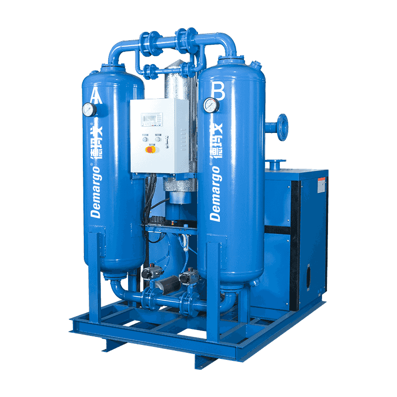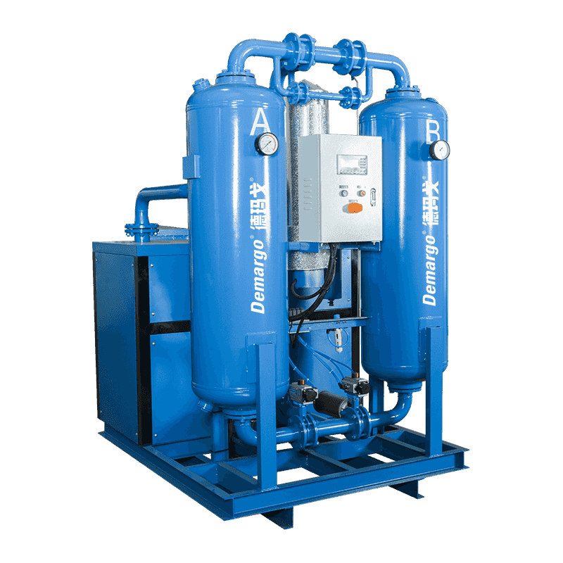 Većina vode, ulja i nekih nečistoća u komprimiranom zraku ovdje se kondenzira, a zrak i vodena para odvojeni su separatorom plinske vode. Voda i ulje se ispuštaju kroz automatski odvod. Komprimirani zrak nakon sušenja zamrzavanja ulazi u adsorpcijski toranj. Komprimirani zrak duboko se adsorbira i osuši načelom adsorpcije tlaka u ljuljanju dok temperatura rosišta ne ispuni zahtjeve. Suhi komprimirani zrak koji izlazi iz adsorpcijskog tornja vraća se u prednjiga da ohladi vrući i vlažni komprimirani zrak iz kompresora zraka kako bi se povećala njegova vlastita temperatura. Grijani suhi komprimirani zrak također može spriječiti kondenzaciju u cjevovodu. Regeneracijski zrak sušilice je suhi vrući zrak izvađen iz zračne utičnice sušilice i zagrijava grijač. Stoga se adsorbent može regenerirati u kraćem vremenu s vrlo malo potrošnje plina. Proces procesa kombinirane sušilice za mikro zagrijavanje prikazan je na slici 2., komprimirani zrak prvo ulazi u predkorušicu kako bi izmjenjivao toplinu suhim komprimiranim zrakom iz sušilice, tako da se povećava temperatura suhog komprimiranog zraka, a istodobno se temperatura komprimiranog zraka prije unosa isparavanja smanjuje, a dio je smanjena na sobu. Zatim ulazi u isparivač radi hlađenja, hlađenja i odvlačenja tako da se komprimirani zrak ohladi na oko 5 ° C.